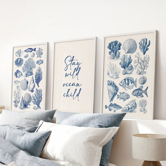 Coastal Sea Life Prints. Blue Sea Shells and Fish Print Set (online exclusive)
