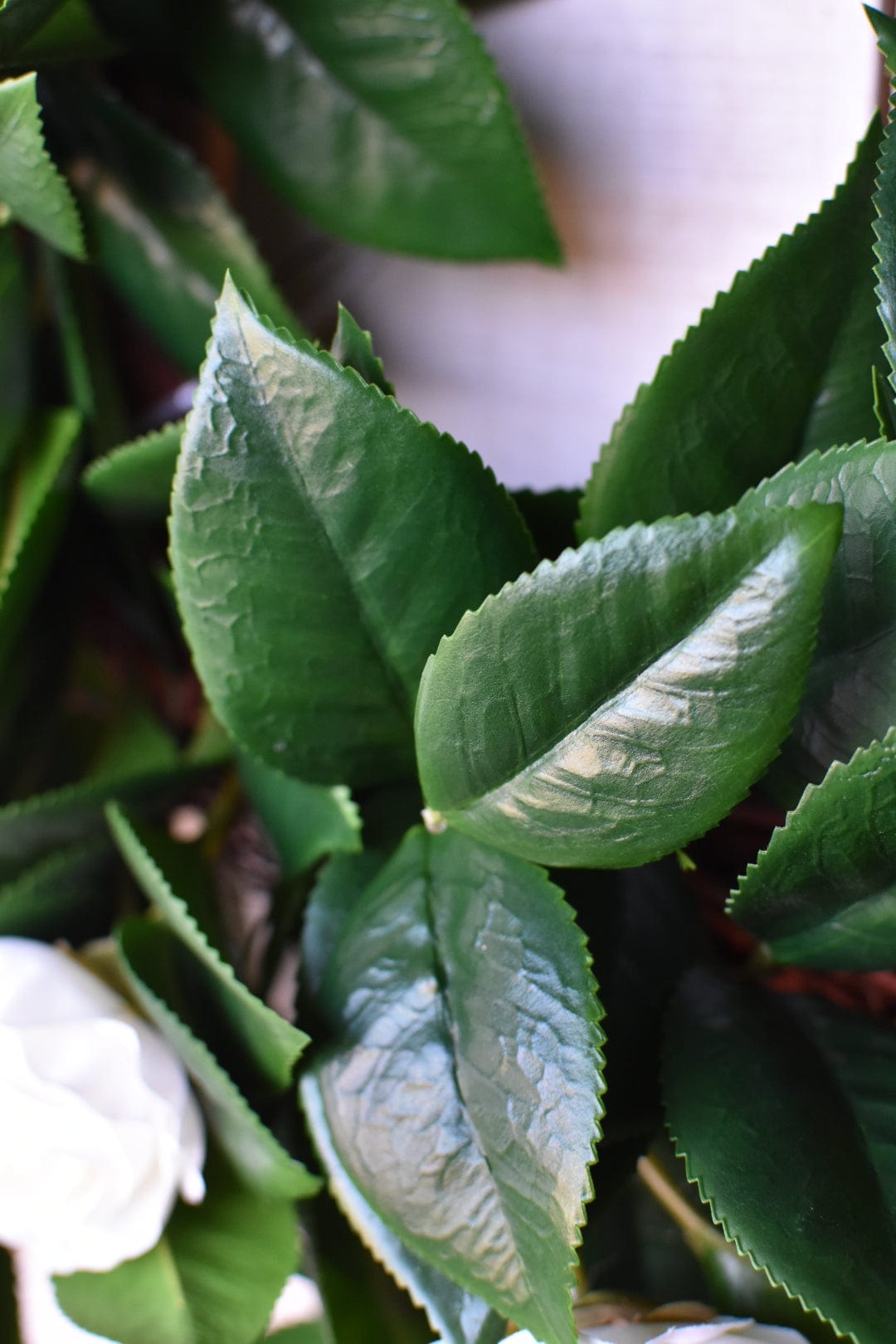 An absolutely STUNNING faux wreath! Camellia Blooms and bud are sprinkled around this massed out Camellia greenery wreath! It's so realistic looking with the waxy front greenery leaves the bloom is known for! Leave as is or add a beautiful bow! Can see these working perfect for Spring and Summer, as well as weddings!