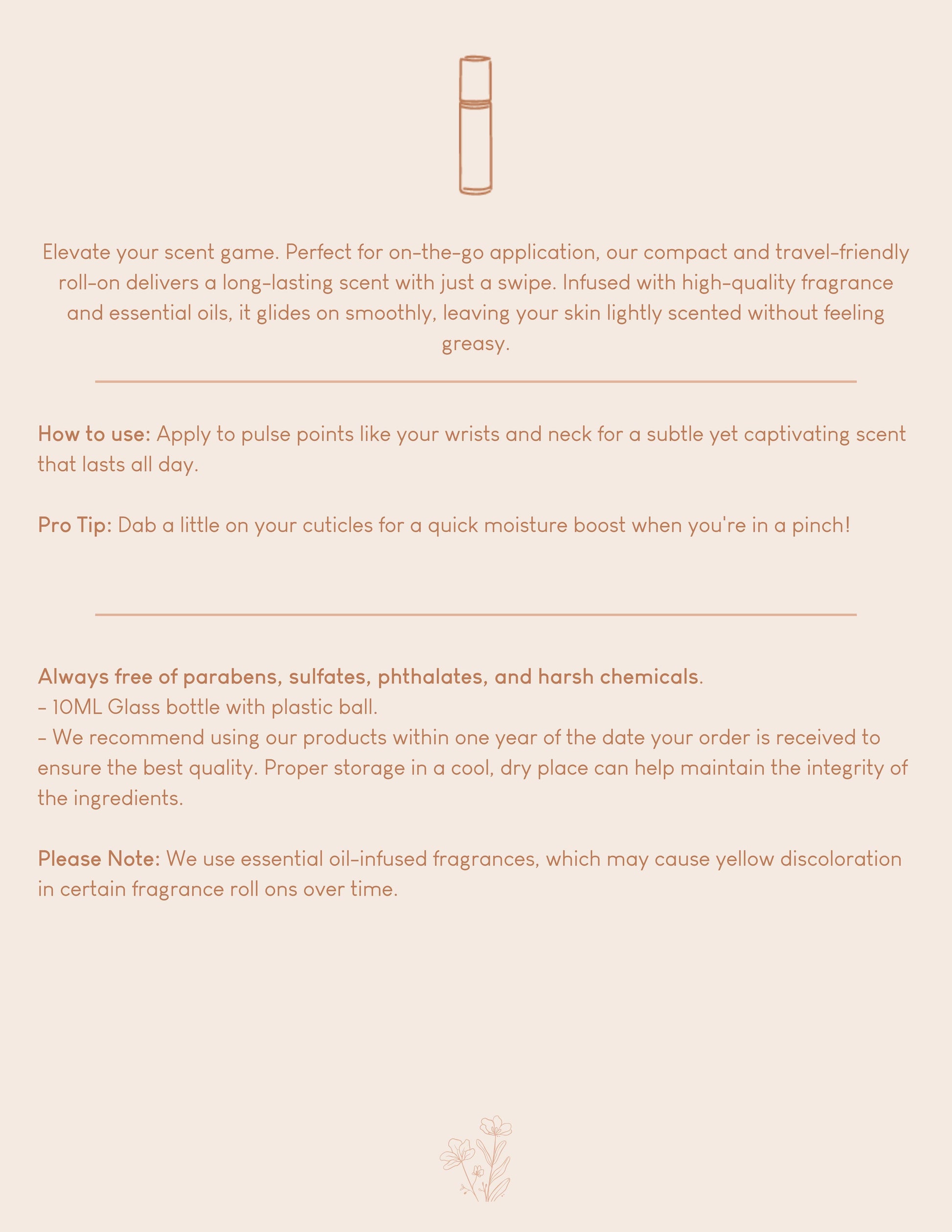Please Note: We use essential oil-infused fragrances, which may cause yellow discoloration in certain fragrance roll ons over time.