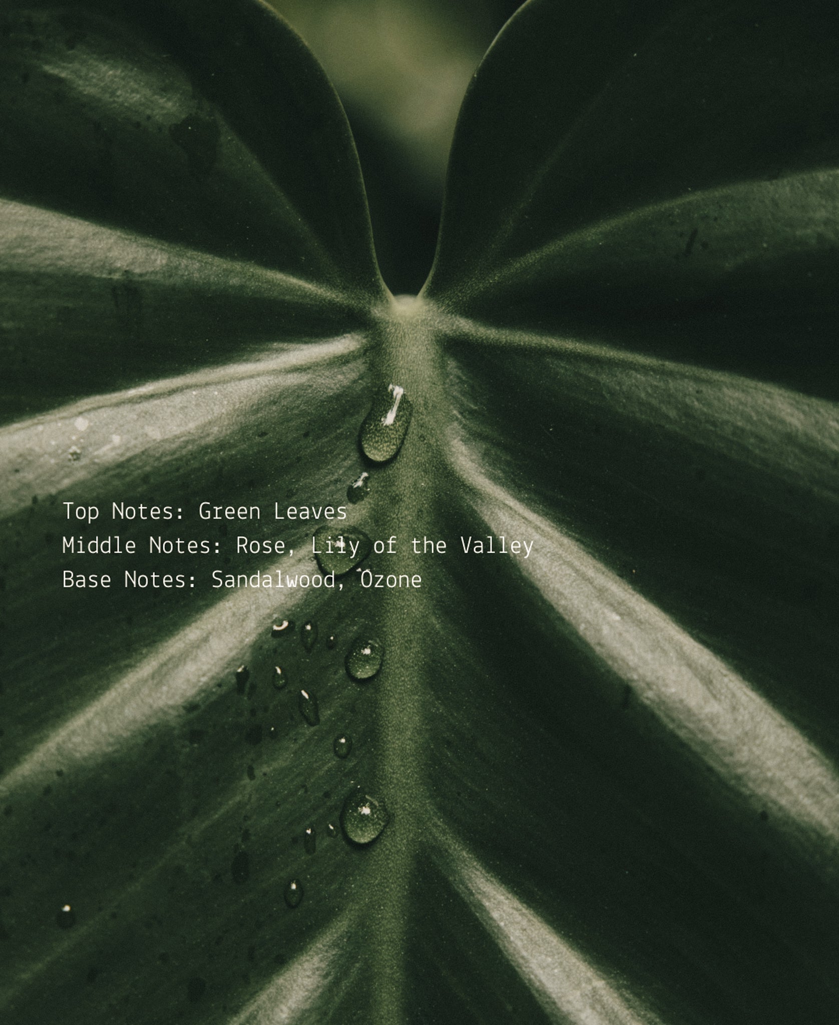 It opens with green leaves—fresh, alive, vibrating with newness. Like stepping barefoot into the jungle at first light. The heart blooms with rose and lily of the valley—gentle, feminine, quietly potent. There’s softness in the healing. The base is sandalwood and ozone—earth and air, rooted and expansive. Cleansing. Sacred. Like smoke after rain.
