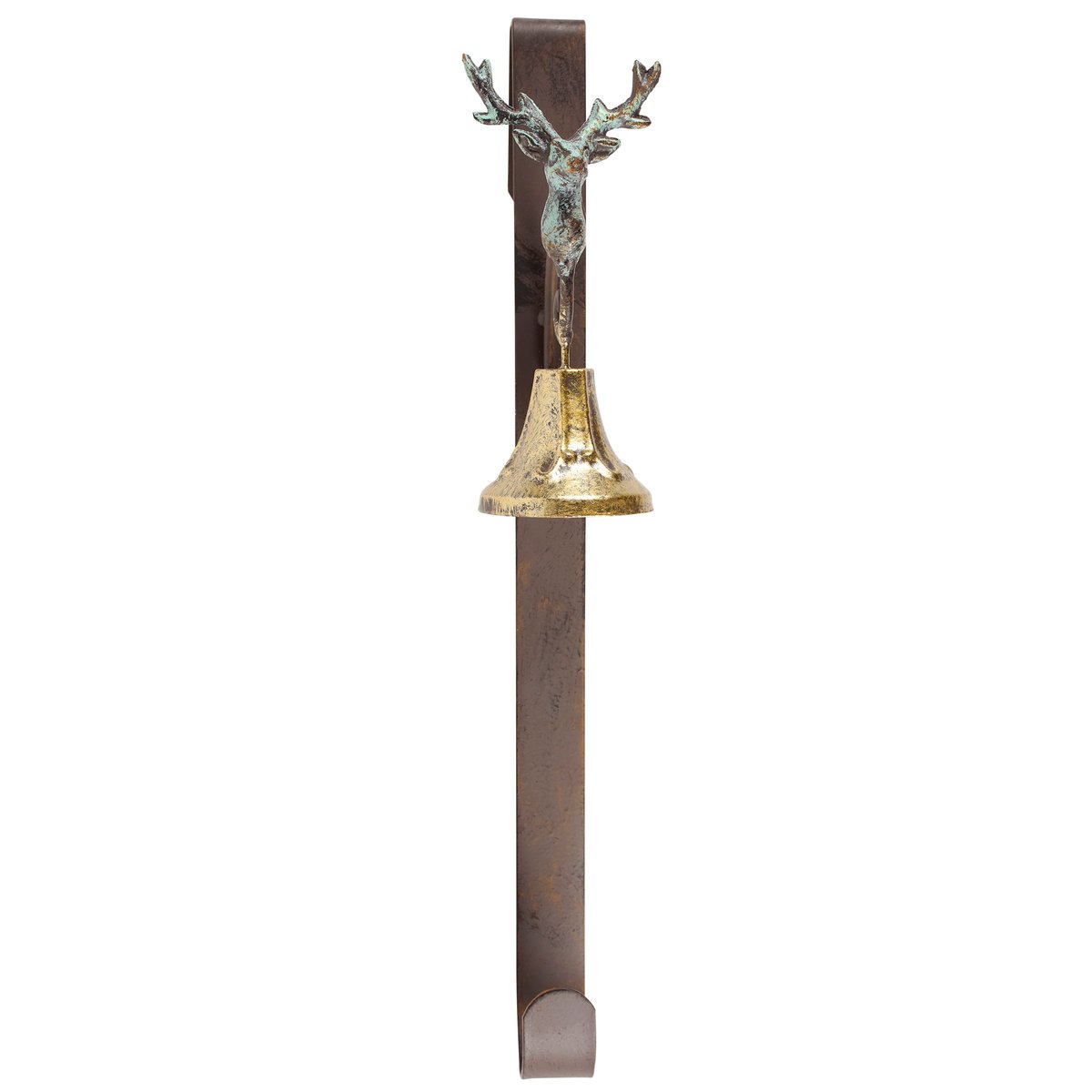 A wreath hanger from our Christmas Collection displaying a vintage metal design that perfectly coordinates with all our seasonal winter wreaths to hang on a door. Vintage seasonal wreath hanger features a metal sculpt of a deer head attached to the top with an aged metal bell hanging below it. Our Bell wreath hanger is a vintage home accent perfect for hanging seasonal wreaths.