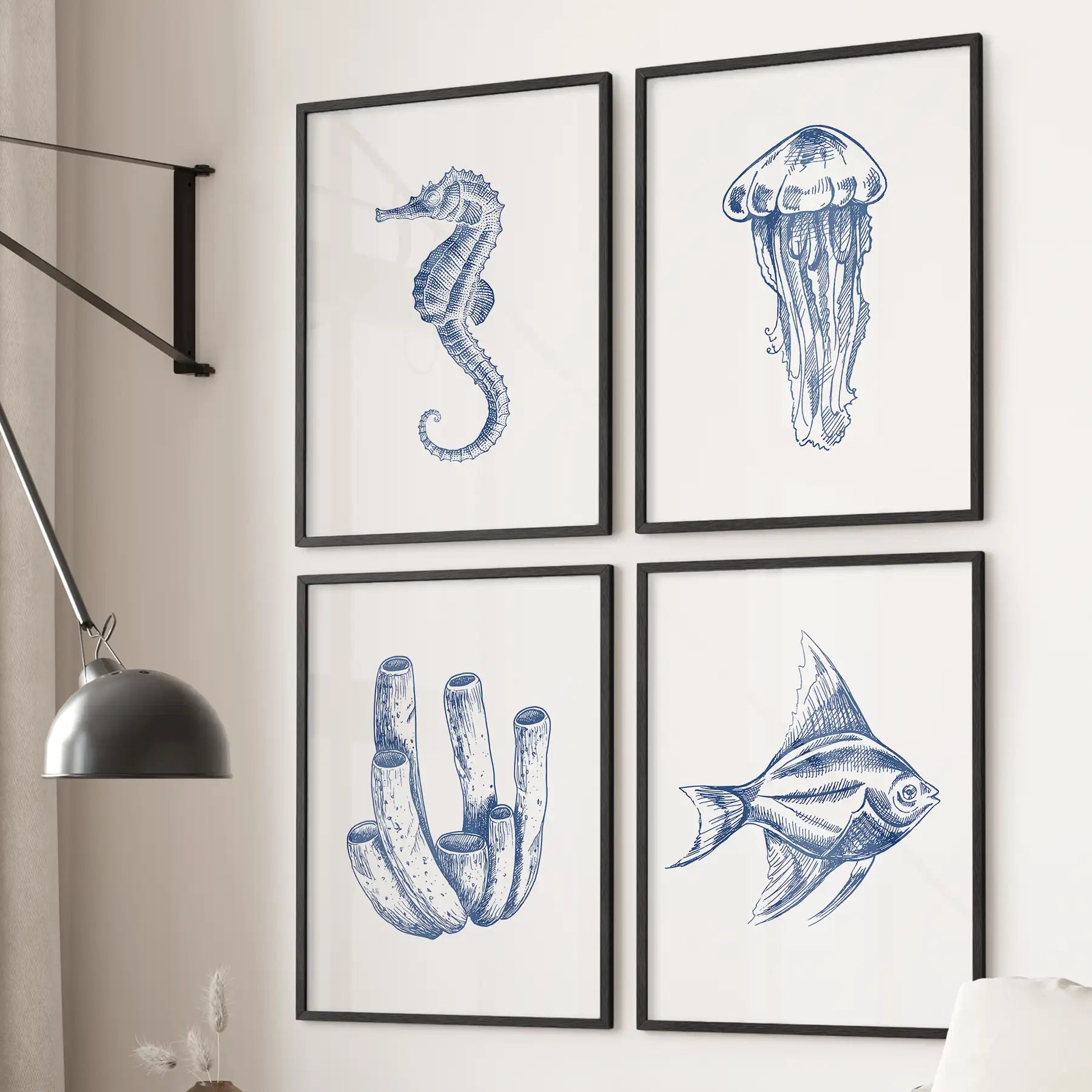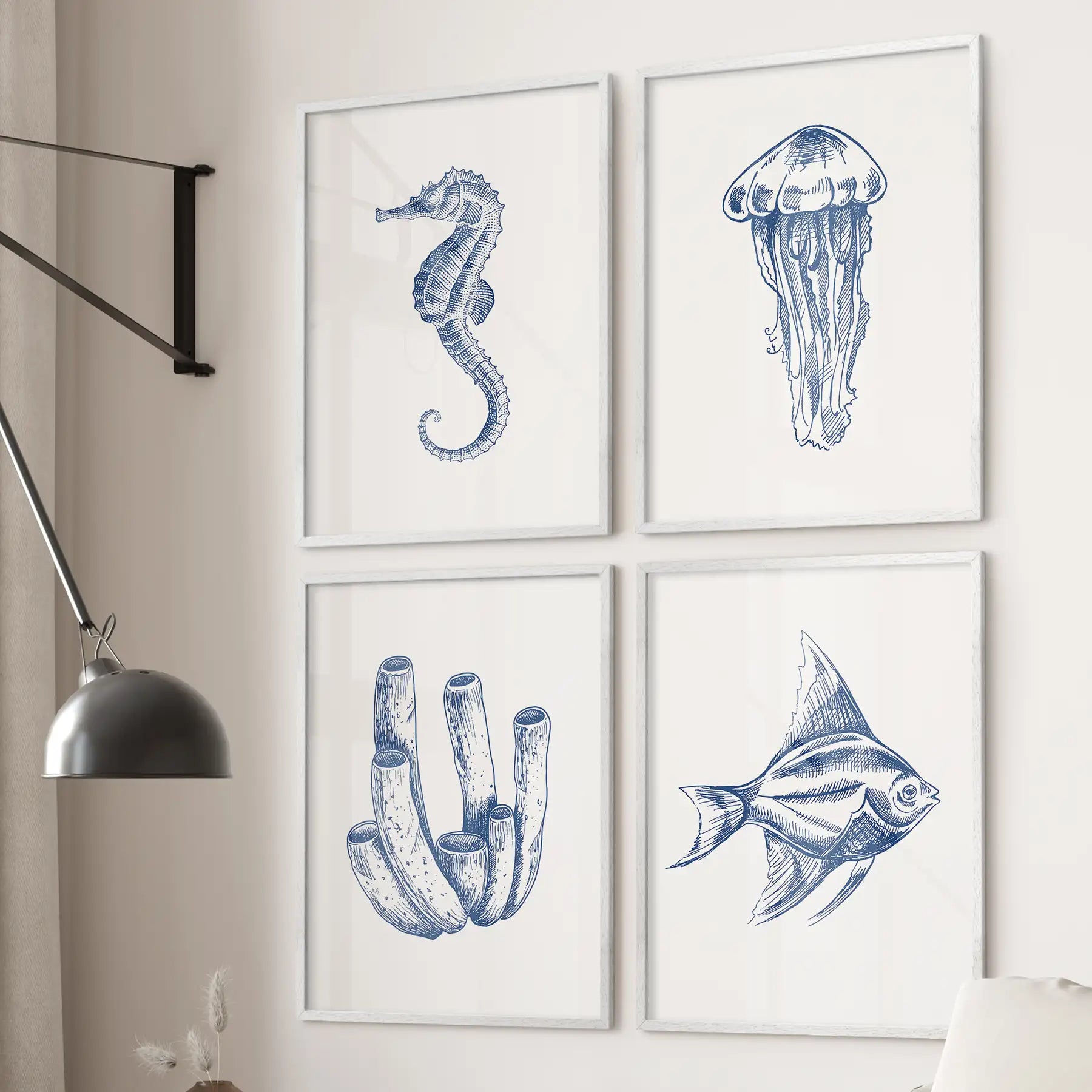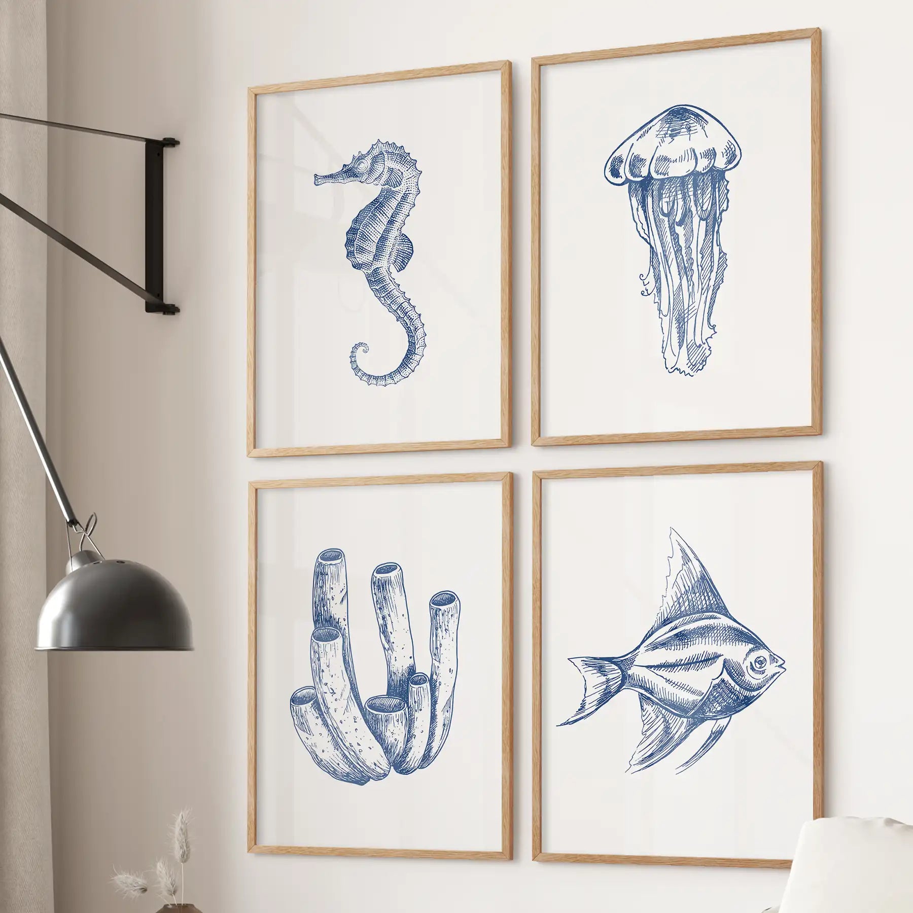 Blue Coastal Artwork. Set of 4 Posters. Jellyfish, Fish Print (online exclusive)