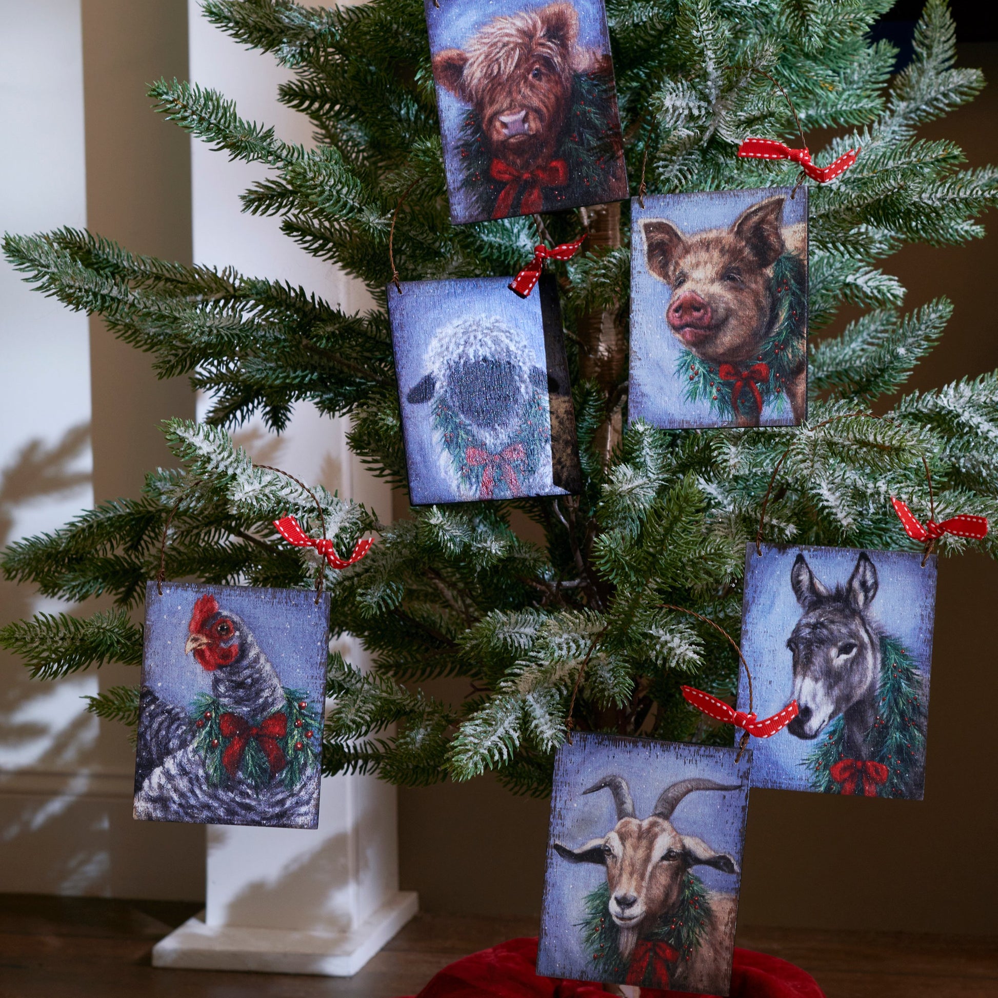 A set of wooden ornaments from our Christmas Collection displaying six charming winter scenes of various farm animals wearing Christmas wreaths. Designs are replicated from original artwork painted onto burlap canvas, giving the art a unique depth and texture. Seasonal ornaments feature distressed details with coordinating Christmas tartan plaid on the back and red cotton tape accent on hanger. Our Christmas Animals ornament set is easy to hang for display via attached twisted wire hangers. Set comes packaged together in a polybag and tied with jute. A rustic set of winter-themed ornaments perfect for seasonal display.