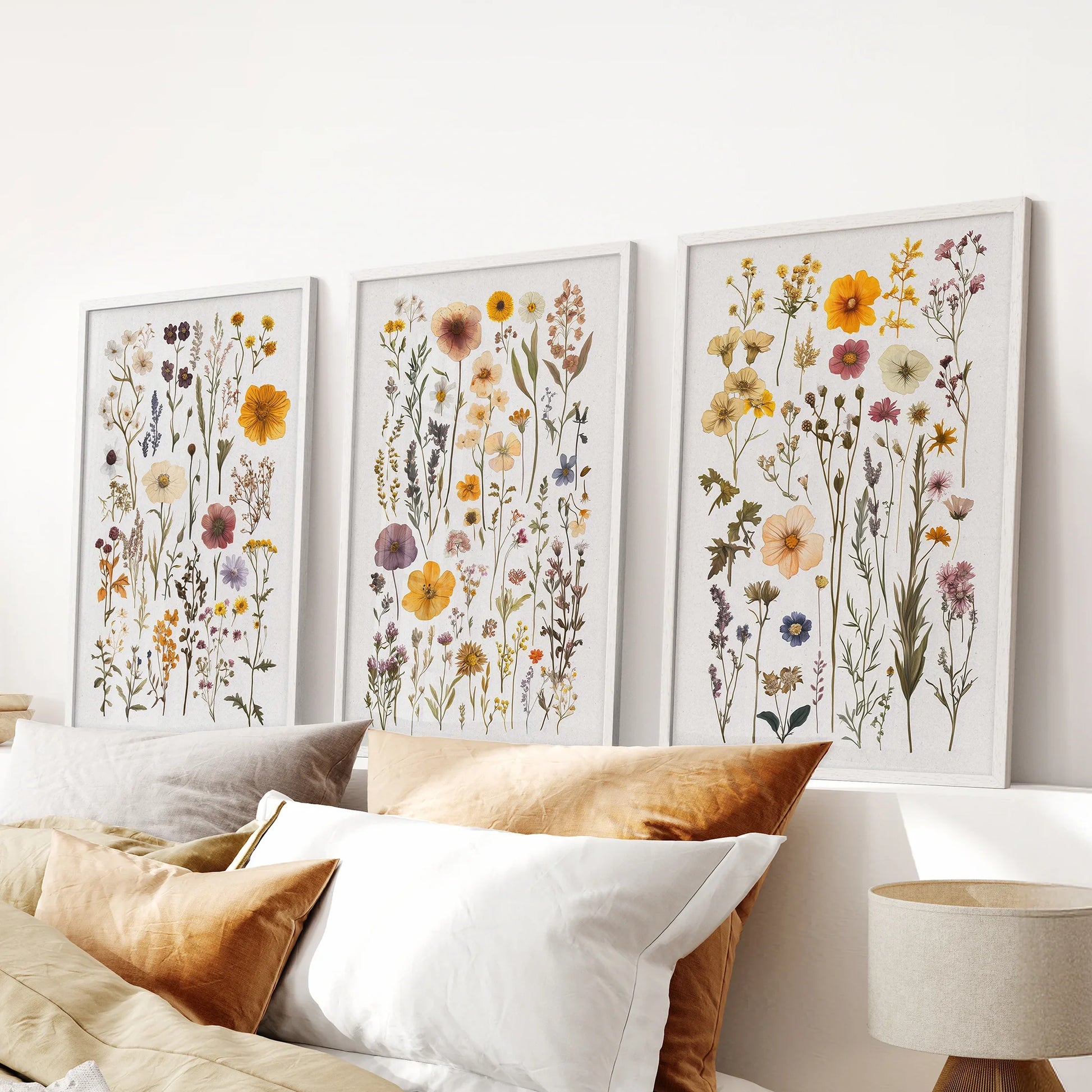 Brighten your home with this set of 3 botanical flower posters. Featuring hand painted wildflowers in warm yellows, soft purples, and earthy tones, this boho style wall art is perfect for modern living rooms, bedrooms, or any cozy corner needing a floral touch.