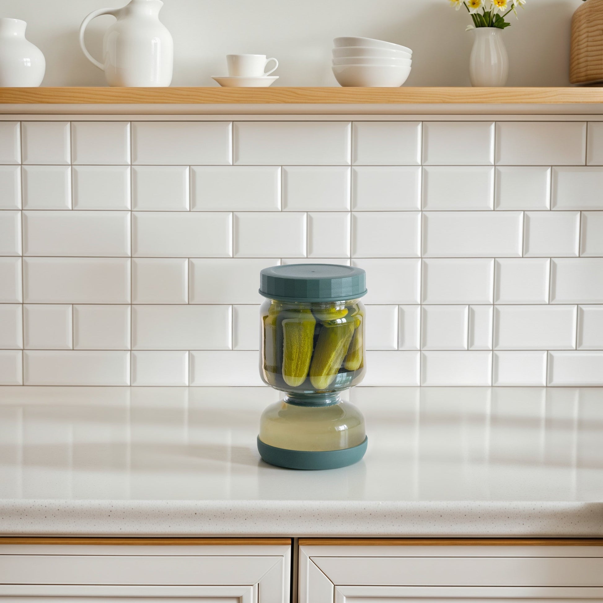 Innovative Juice Flow Mechanism: By simply flipping the jar, the juices flow to the bottom while the pickles, olives, or peppers stay on top. Now, enjoy your pickles without submerging your fingers into the juice.
