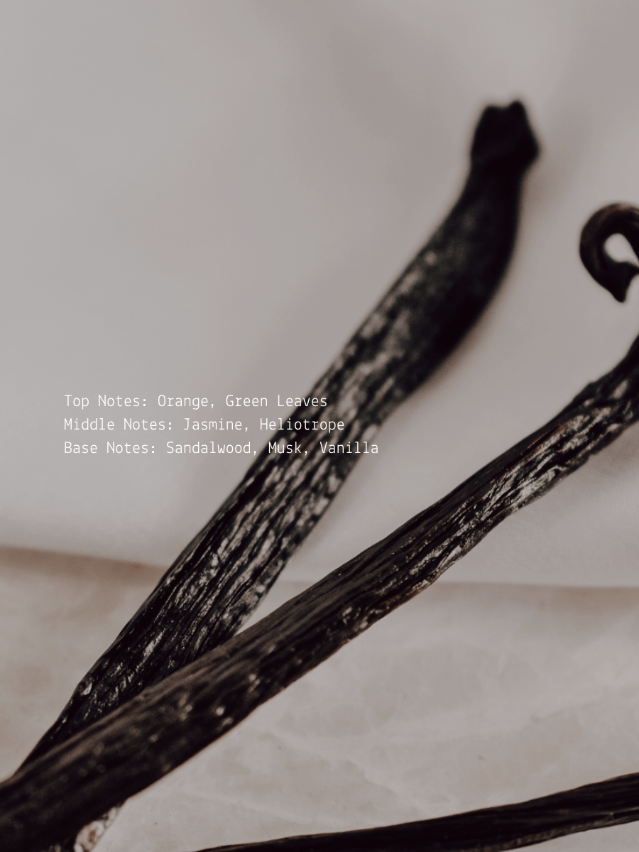 A soft–citrus composition crafted for ease, gentleness, and honest joy. Sun-warmed orange and verdant green leaves open bright and clean—cutting through static and clearing space around you. Jasmine and heliotrope unfold at the heart—delicate, intimate, and lightly radiant, like skin touched by late afternoon light. Sandalwood, sheer musk, and a trace of vanilla anchor the base—soft, slow, and almost imperceptible, settling the moment into quiet ease.