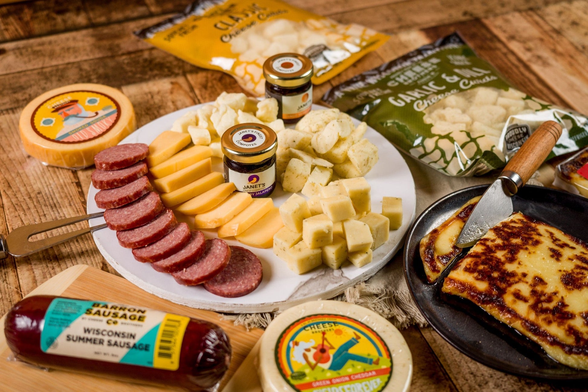 - Seventeen 6 oz. blocks of Wisconsin-made cheese (Smoked Gouda, Dill Havarti, Fratello, Smoked Mozzarella, Honey Sriracha Gouda, Smoked 3 Amigos Spicy Gouda, Mango Habenero Gouda, Diablo Scorpion Pepper Gouda, Bourbon Gouda, Smoked Provolone, Smoked Cheddar, Sharp Cheddar, Gouda, Horseradish Cheddar, Green Onion Cheddar, Smoked Adelheid Alpine-Style, Non-Smoked Adelheid)