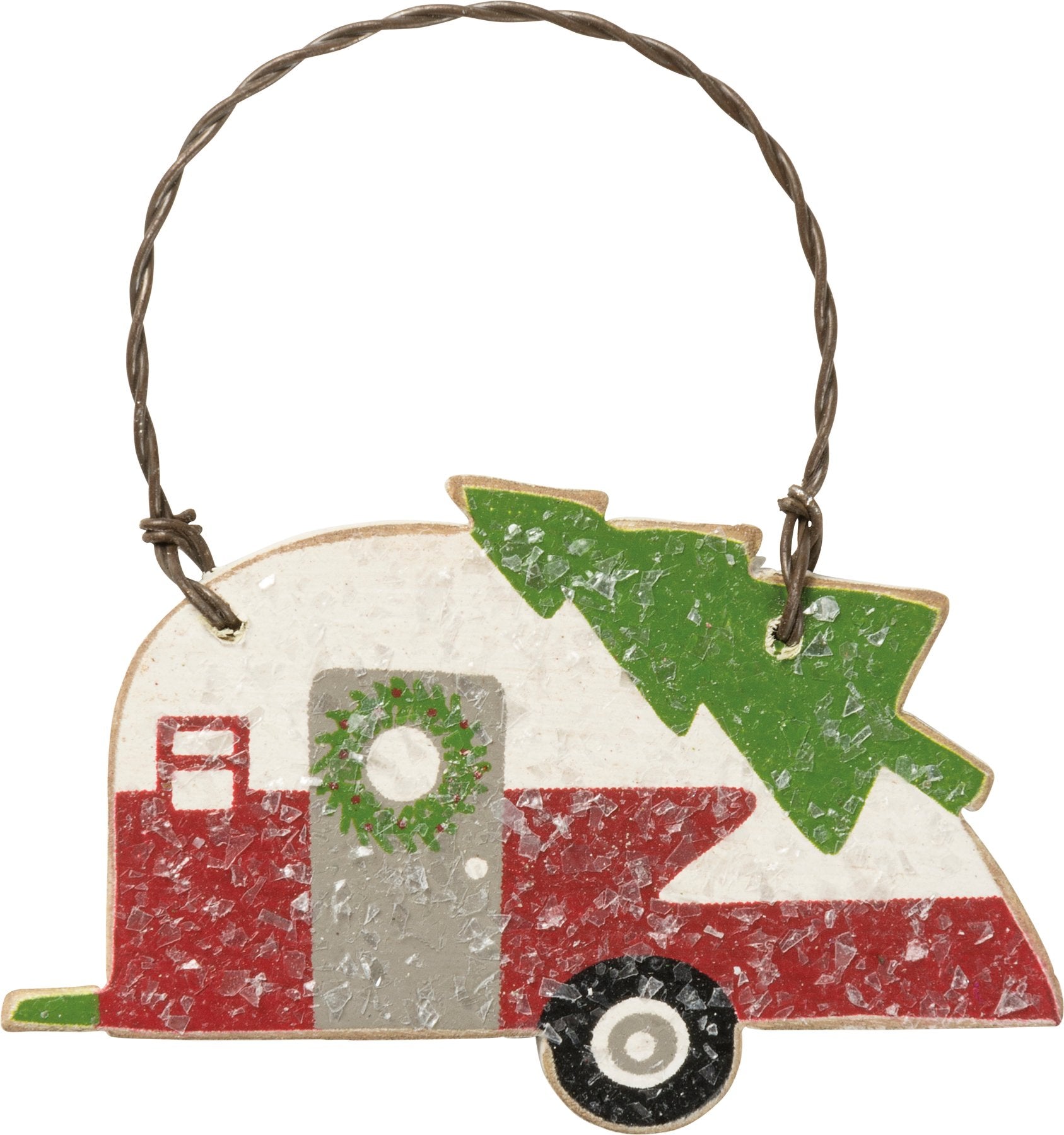 A set of three camper-shaped ornaments from our Christmas Collection featuring hand lettered "Home For The Holidays" and "Merry Christmas," sentiments, tree accent, and textured coating for snowy effect. This Merry Christmas Ornament Set contains twisted top wire loops for easy hanging.