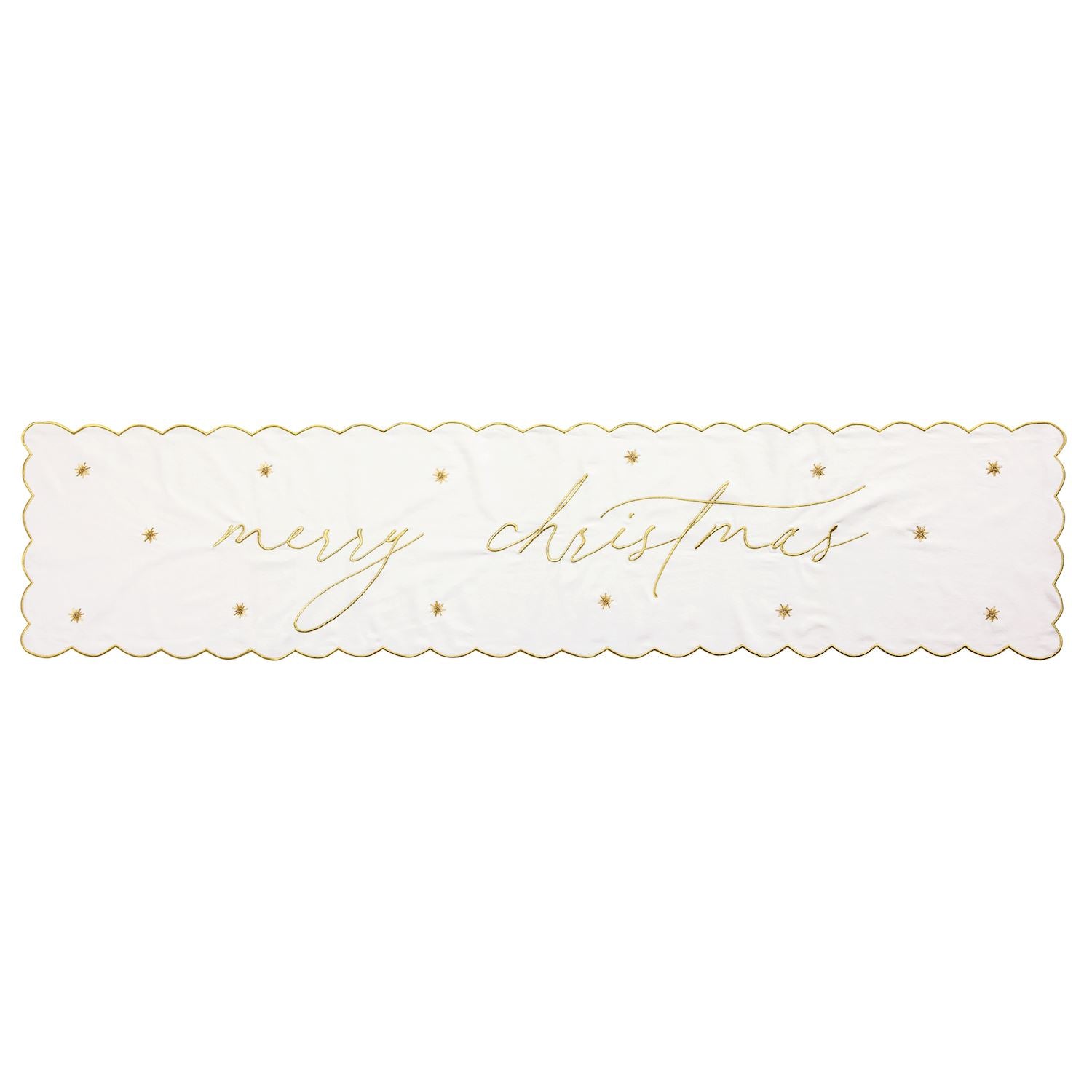 Elevate your holiday dining experience with this exquisite Merry Christmas Table Runner. Crafted from 100% premium cotton, this table runner combines elegance and festive charm, making it a perfect addition to your seasonal decor. Measuring 16" x 72", it fits beautifully on most tables, adding a touch of sophistication to your gatherings. The intricate gold lurex embroidery weaves a shimmering pattern that captures the light, while the delicate bead and scallop detailing enhances its luxurious appeal. Whether you're hosting a grand Christmas dinner or a cozy family meal, this table runner sets the stage for memorable celebrations. Easy to care for and durable, it promises to be a cherished part of your holiday traditions for years to come.