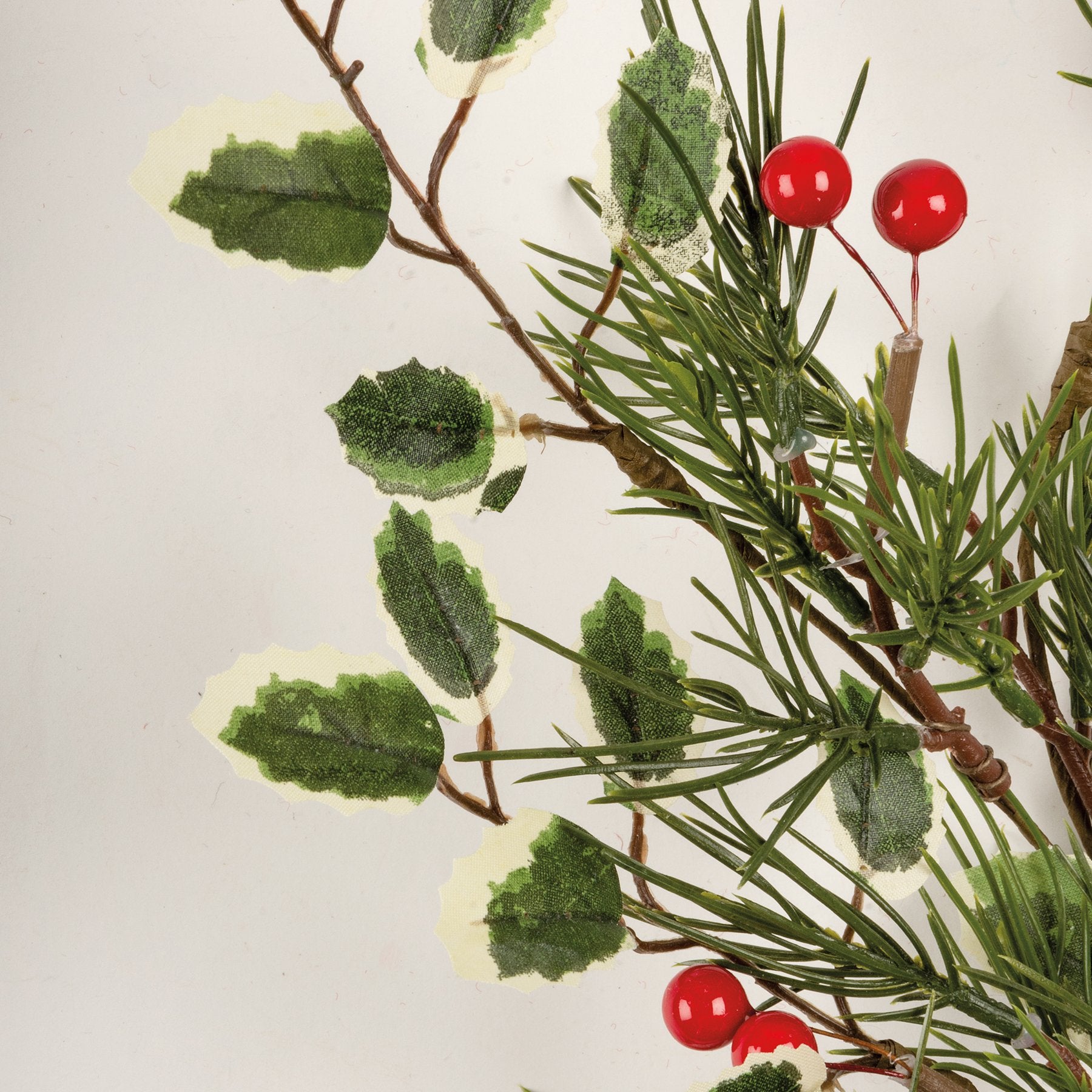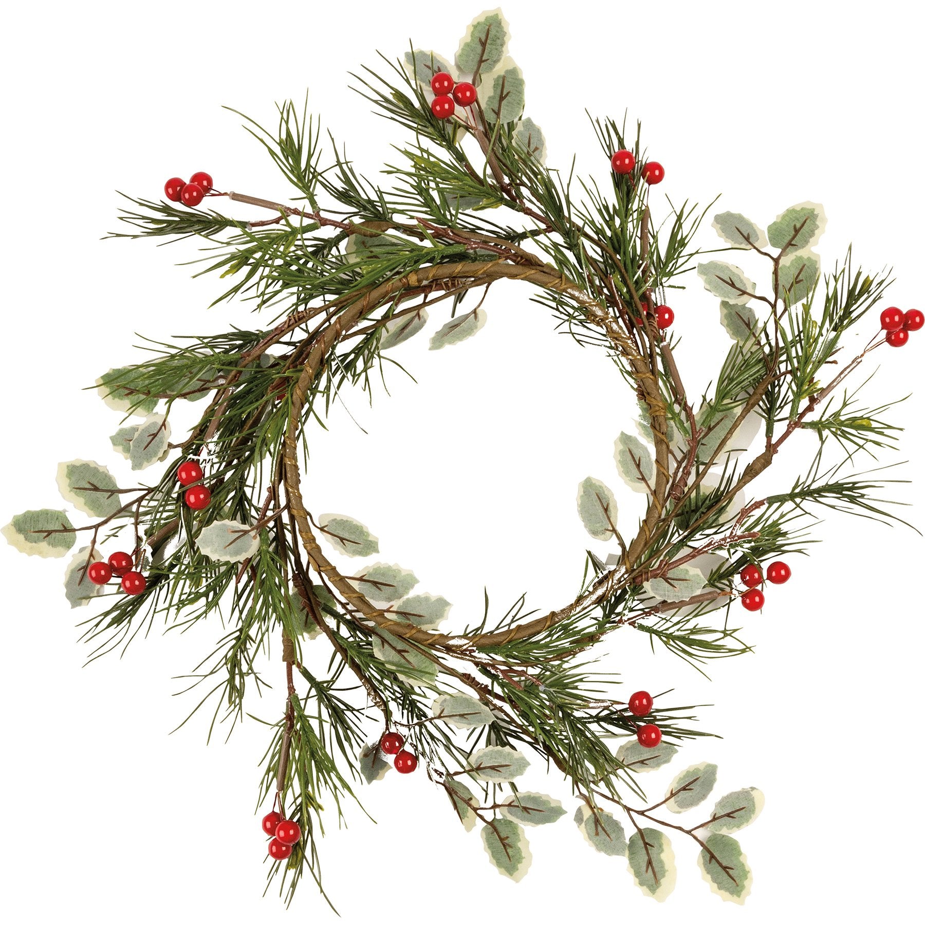 A pine and holly candle ring that adds a refreshing touch to any candle display. Perfect for adding a winter or Christmas aesthetic to any candle.