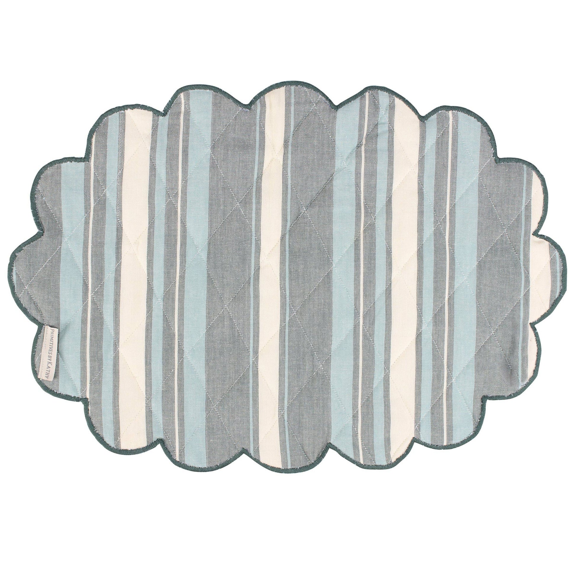 A double-sided cotton placemat from our Botanical Collection displaying a floral inspired vintage pattern in a blue color palette and coordinating blue and cream stripe pattern on the back with quilted details on both sides and scalloped edge made with blue thread. Our Blue Floral cotton placemat set is conveniently machine-washable for easy cleaning. A vintage tabletop accessory perfect for customizing everyday place settings.