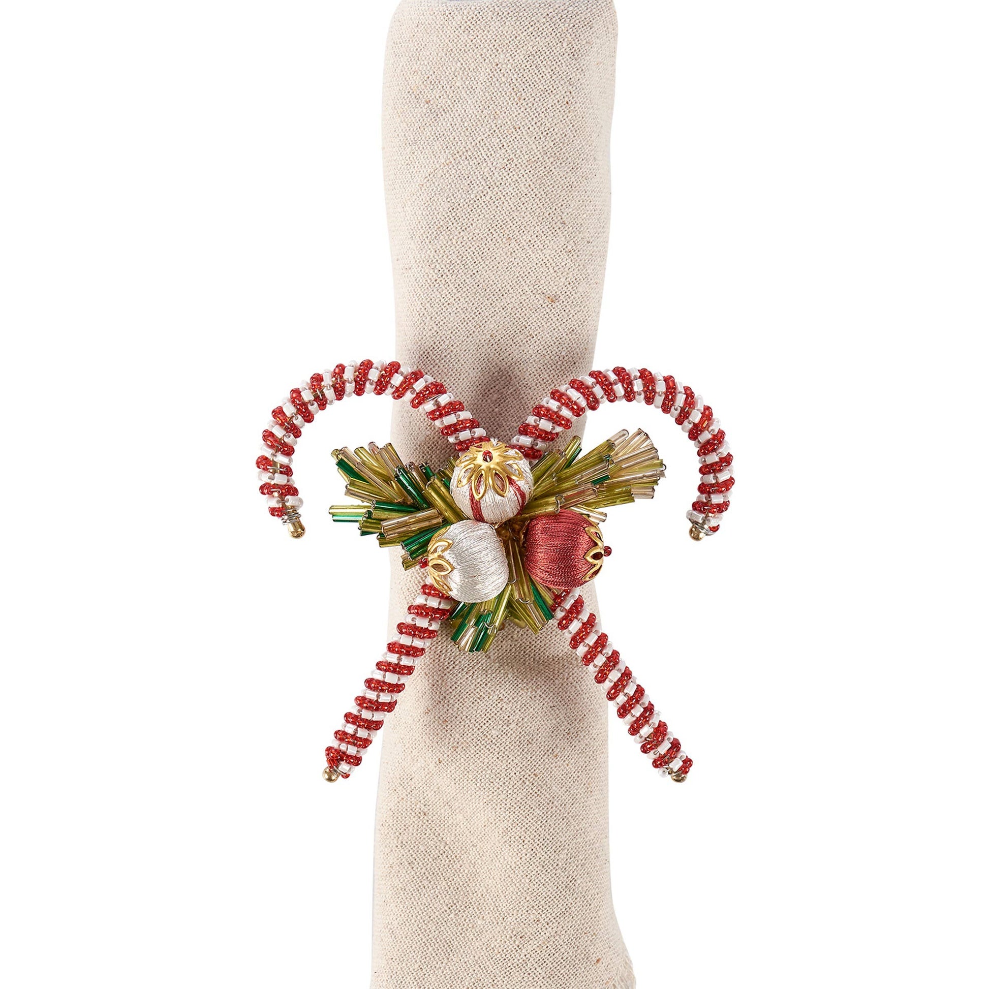 A decorative napkin ring from our Christmas Collection featuring a craft style design of candy canes combined with bulb ornaments. Our Candy Cane napkin ring includes a red and white ring to easily slip over rolled napkin and can be added to table setting when not in use as a seasonal accent. Napkin pictured not included. A fun tabletop accessory perfect for seasonal gatherings.