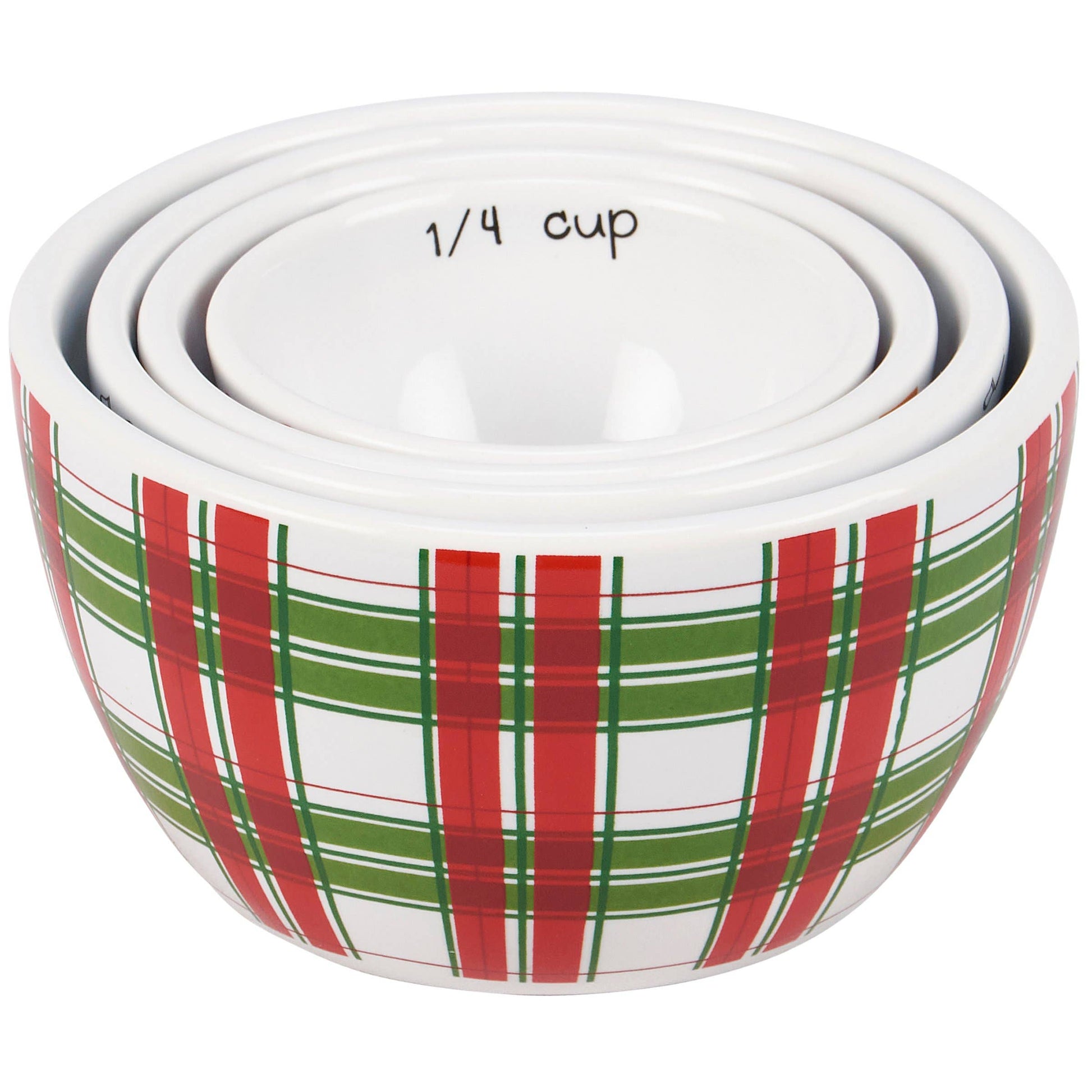A set of stoneware measuring cups from our Christmas Collection displaying various Christmas themed patterns on each. Measuring cup set includes 1 cup, 1/2 cup, 1/3 cup, and 1/4 cups that nest inside each other for easy storage. Designs include full wrap-around Christmas plaid, a pattern of illustrated baking items, gingerbread inspired plaid, and a pattern of candy canes. Seasonal measuring cups also feature an inside design of it's measuring size. Our Christmas Baking measuring cup set is conveniently microwave, oven, dishwasher, and food safe for easy use. A fun Christmas gift perfect for seasonal baking.