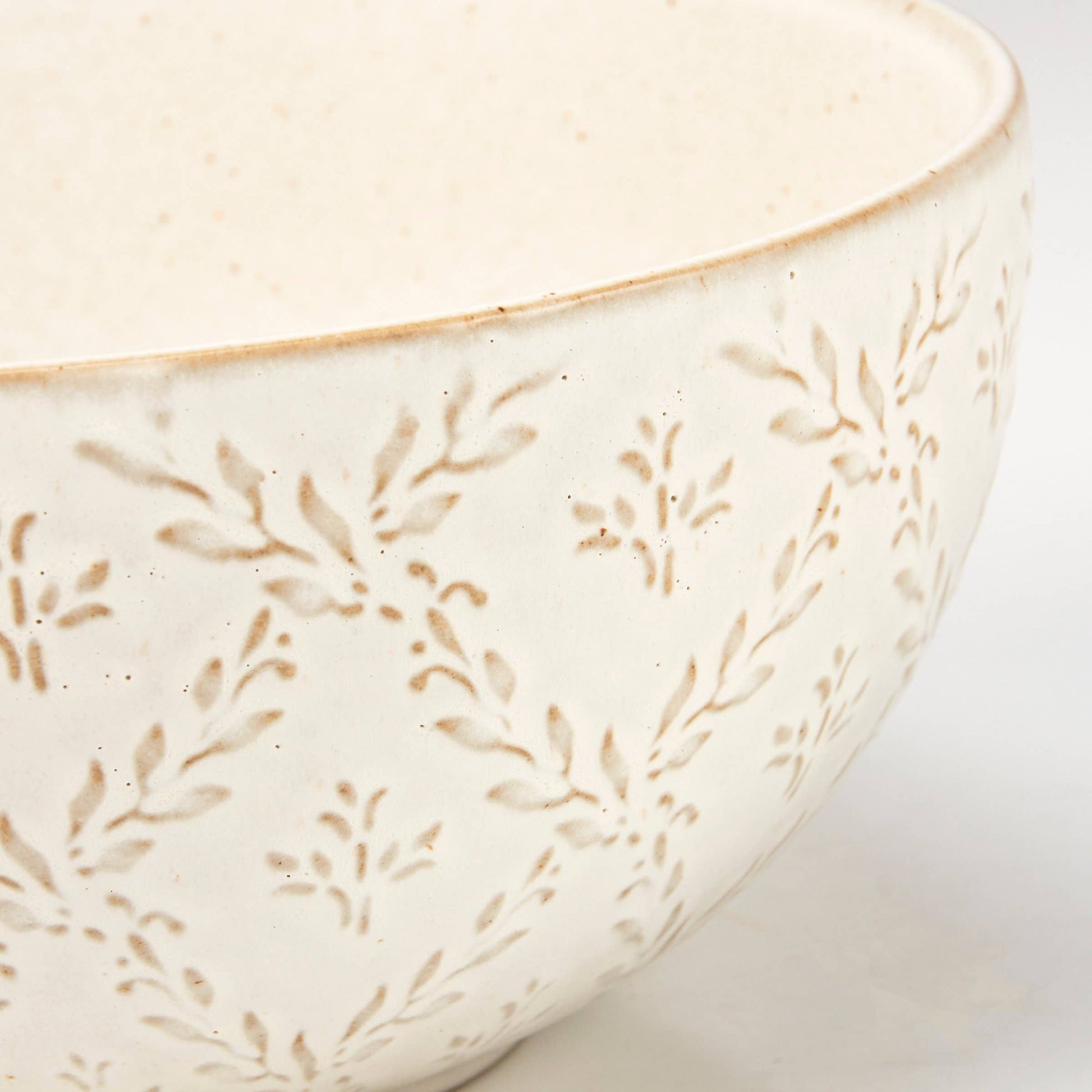 A durable ceramic serving bowl from our Cottagecore Collection displaying a cream glaze finish with embossed patterns of plant vines around the bowl. Embossed vine designs come through the glaze for textured detail. Our Cottage Vine serving bowl features a neutral color palette to easily coordinate with a variety of table décor. Hand wash only. An elegant piece of tableware perfect for everyday gatherings.