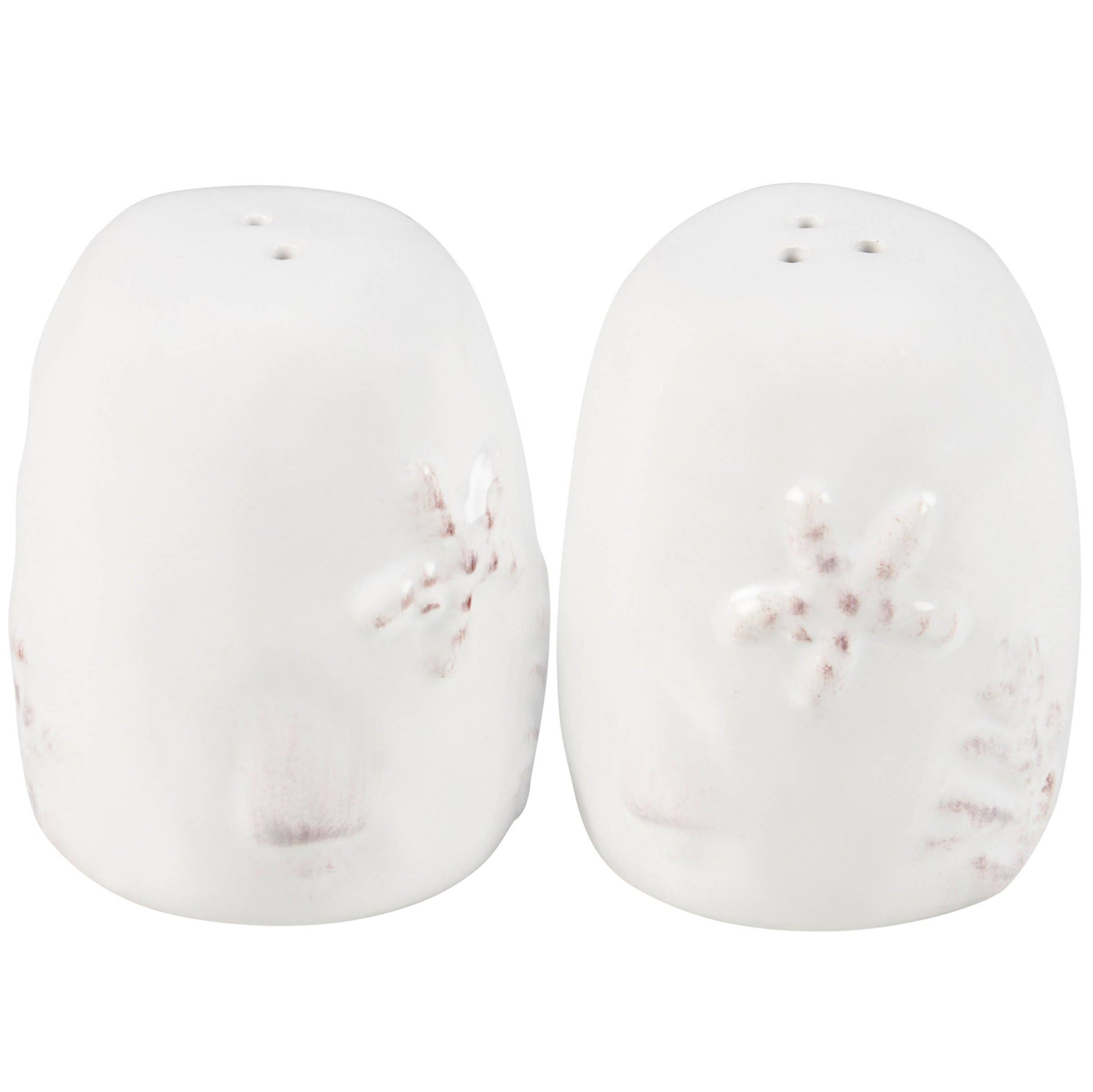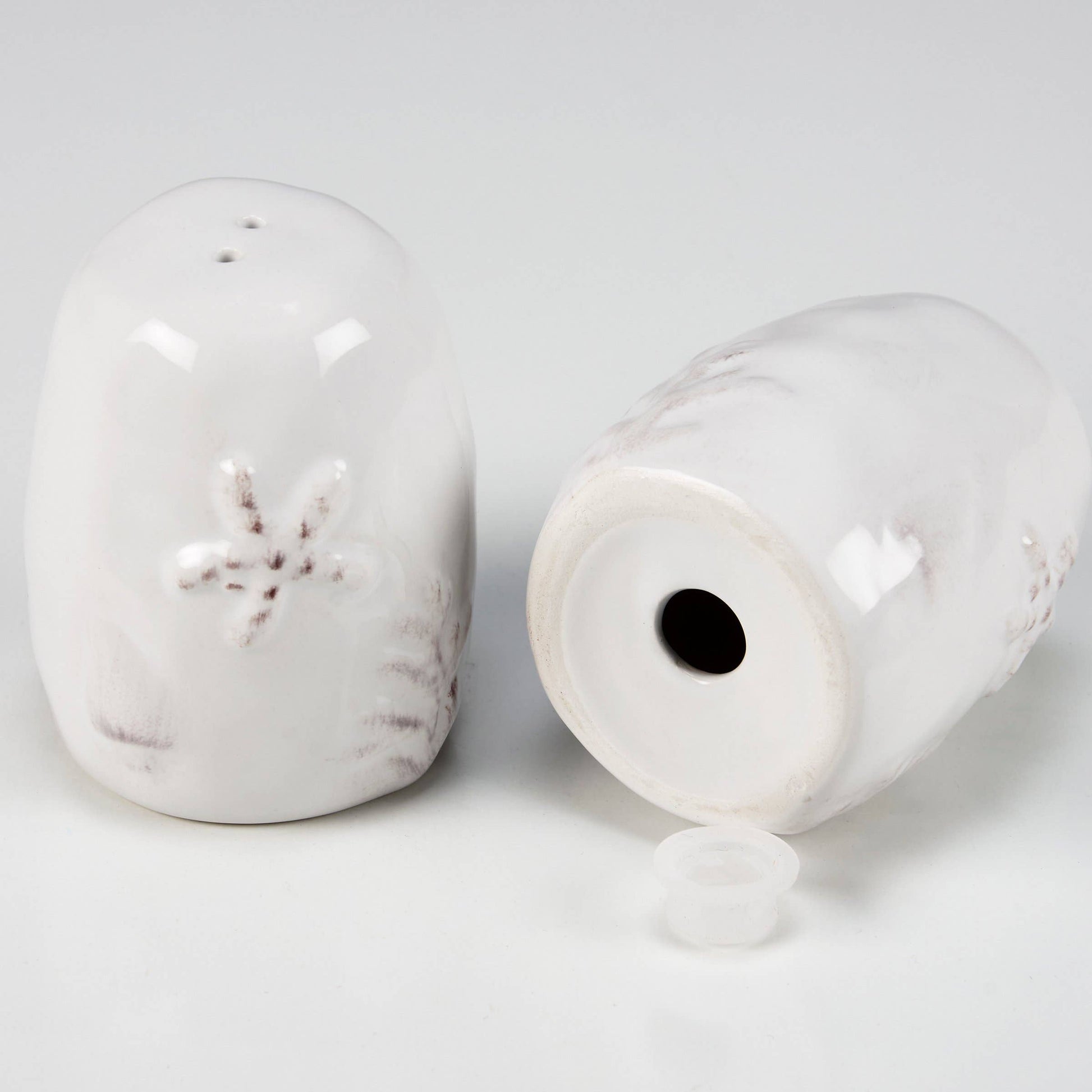 A set of ceramic salt and pepper shakers from our Beach Collection displaying a clean white glaze finish with embossed designs of various sea life and ocean plants around the outside. Embossed ocean designs feature textured detail. Shakers include unique openings to tell them apart as well as plastic stoppers for easy refilling and cleaning. Our Beach salt and pepper shakers are microwave, dishwasher, and food safe for convenient use. A set of everyday tableware perfect for oceanic themed gatherings.
