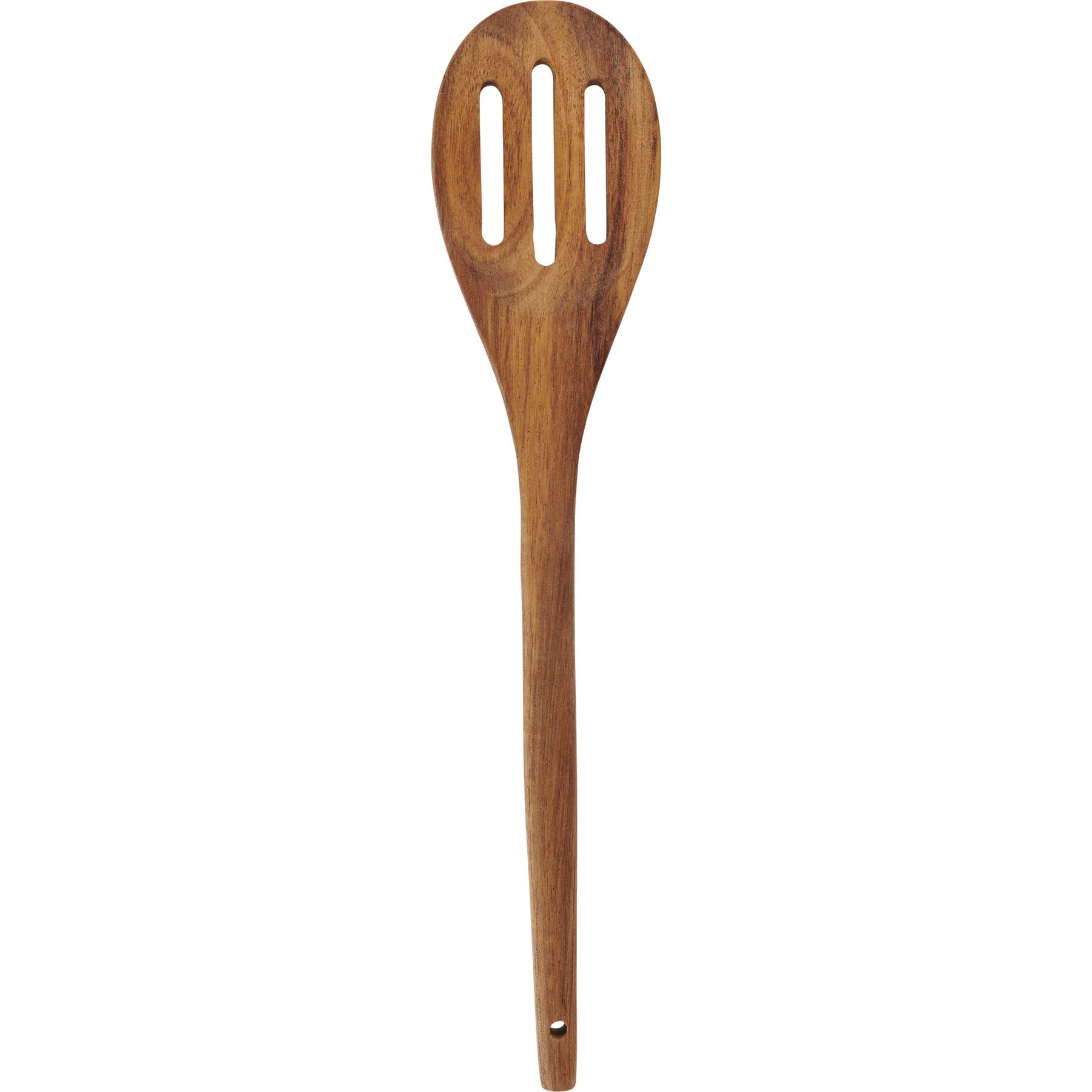 A wooden slotted spoon displaying a simple farmhouse design. Coordinates well with kitchen décor from our Cottagecore Collection. Our Simple Farm slotted spoon includes hole for hanging in kitchen. Hand wash recommended. A neutral everyday kitchen accessory that blends with a variety of styles.