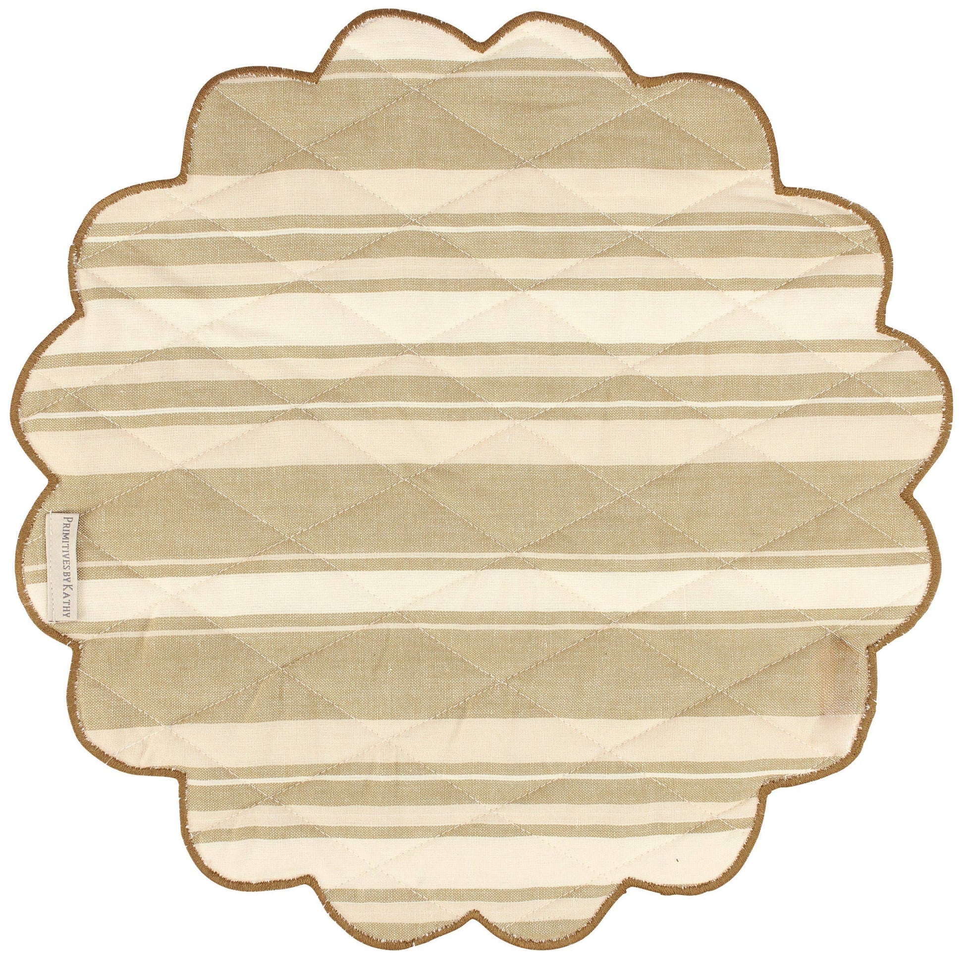 A double-sided cotton placemat from our Botanical Collection displaying a floral inspired vintage pattern in a tan color palette and coordinating tan and cream stripe pattern on the back with quilted details on both sides and scalloped edge made with tan thread. Our Tan Floral cotton placemat set is conveniently machine-washable for easy cleaning. A vintage tabletop accessory perfect for customizing everyday place settings.