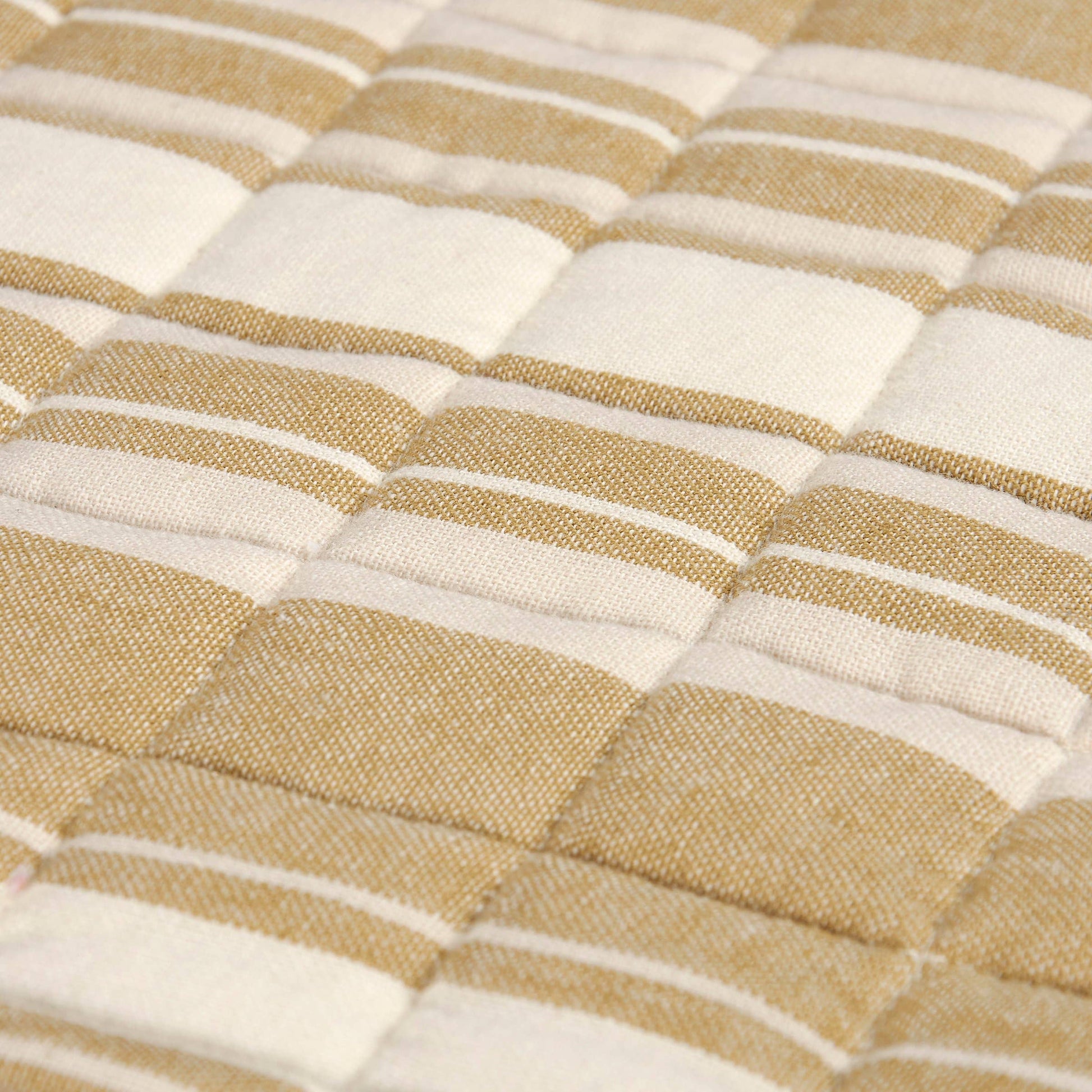 A double-sided cotton runner from our Botanical Collection displaying a floral inspired vintage pattern in a tan color palette and coordinating tan and cream stripe pattern on the back with quilted details on both sides. Floral runner can be used as table décor or as an accent to a home décor display and features 56 inches of length for plenty of coverage. Our Tan Floral runner is conveniently machine-washable for easy cleaning. A vintage floral-themed home accent with a variety of display options.